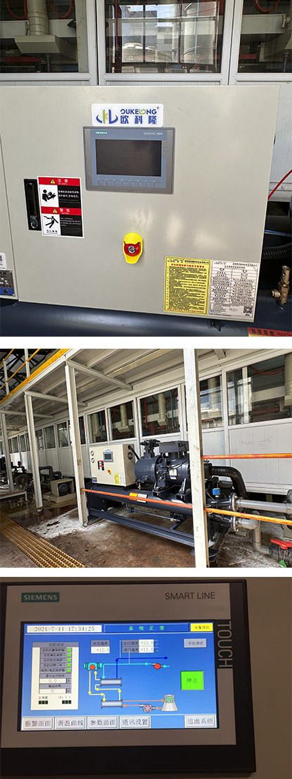 本案位于湖北十堰國企二汽某五金件廠大型電鍍生產(chǎn)線配套的水冷螺桿式冷水機,二次購買案例。