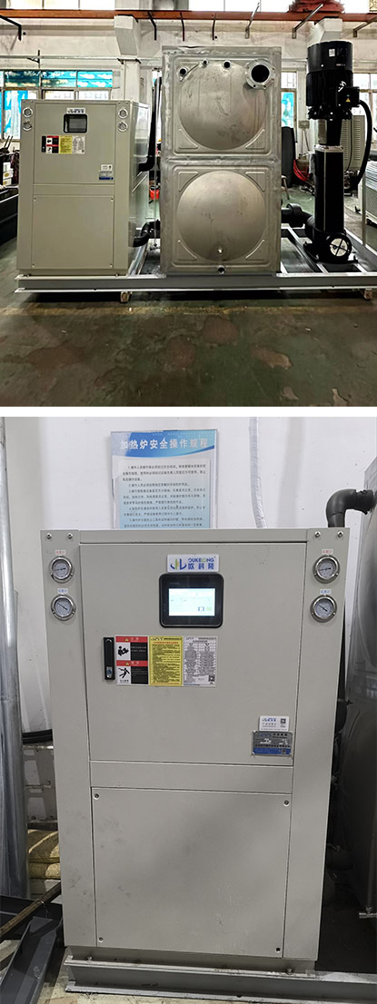 本案為東北大學(xué)實(shí)驗(yàn)室,冷軋鋼實(shí)驗(yàn)室使用的分體式冷水機(jī),散熱外機(jī)放置在室外通風(fēng)散熱良好處。內(nèi)機(jī)和水箱水泵撬裝一體,帶撬裝1立方水箱,一臺(tái)45KW功率變頻水泵。水的壓力流量變頻可調(diào)。